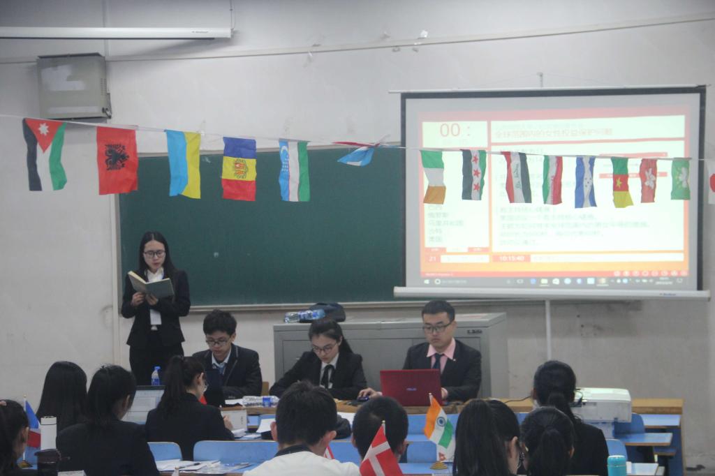 本次活动以“全球范围内女性权益的保护问题”为主题,采用“双代表制”,并遵循罗伯特议事规则进行研讨辩论。会上,首先由代表中国、英国、美国、法国等21个国家的学生分别阐述自己国家在“全球范围内女性权益的保护问题”上的基本立场,随后21个国家的代表对该问题所存在的分歧展开辩论。期间,各国代表为自己“国家利益”据理力争、旁征博引,唇枪舌剑,不仅表现出了鲜明的国家特色和较高的演说技巧,同时也展现了我校学子独特的魅力。