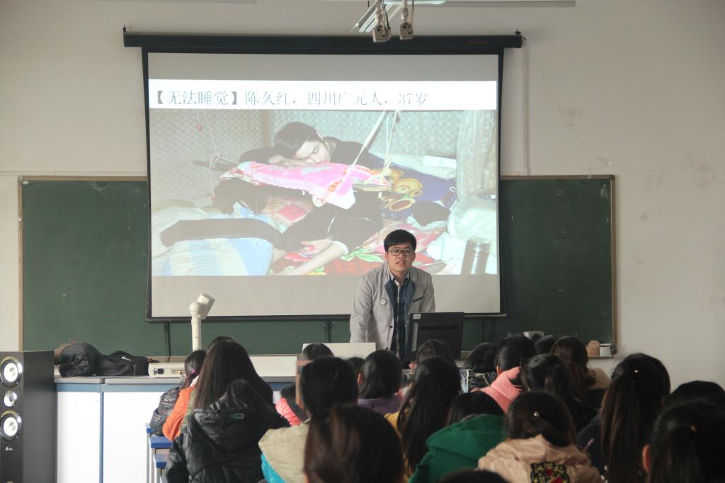 学生进行了一场尘肺病知识讲座。胡祺老师通过介绍一些真实的尘肺病病人的案例,向大家分享了大爱清尘中的故事及救助理念,让同学们了解目前我国尘肺病病人的现状。