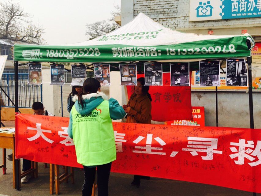 青协的志愿者们在校医院门口向路人展示尘肺病的相关图片,并发放宣传资料,讲解尘肺病相关知识,号召更多的人参与到“大爱清尘”活动中来。