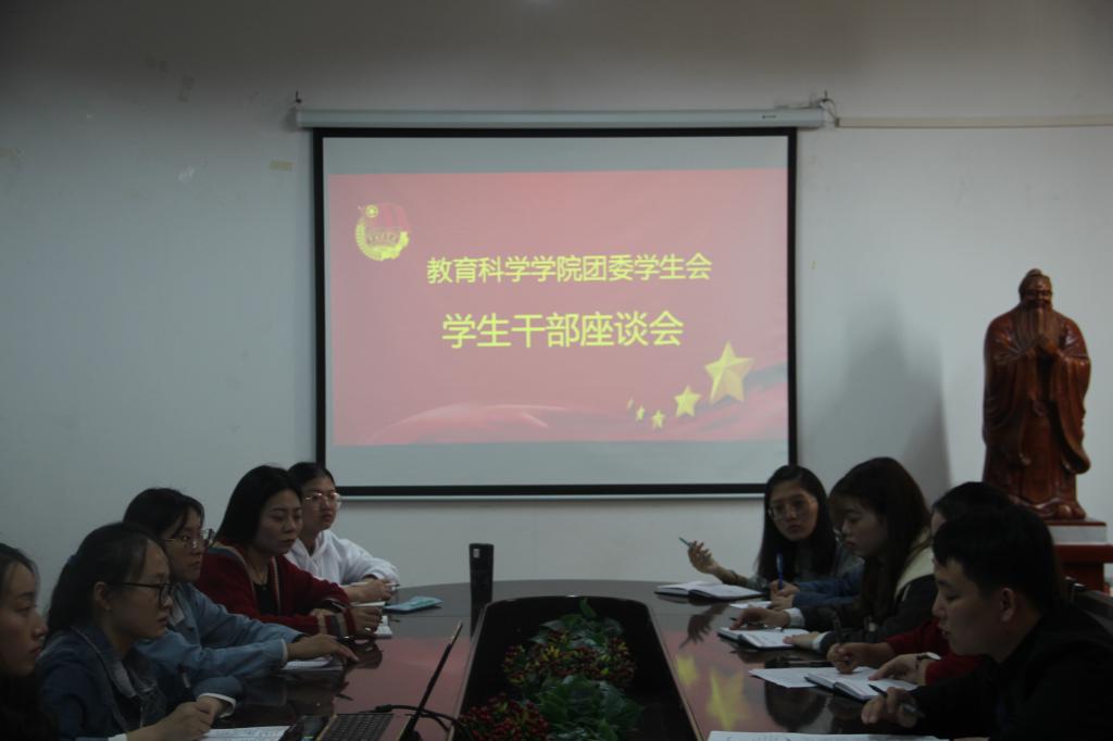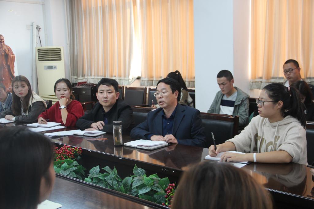 10月12日下午,院团委邀请院党委书记吴文国在田家炳五层院会议室召开学生干部经验分享会,全体学生会干部和各班级主要学生干部参加会议,会议由院团委书记宁志恒主持。