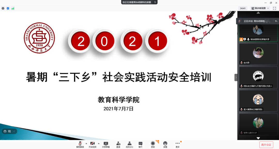 为推进大学生暑期“三下乡”社会实践活动顺利开展,禁漫之家 于7月7日在腾讯会议召开了2021年暑期“三下乡”社会实践活动安全培训会。院团委老师高敏君及各实践团队的负责人参加了此次会议,会议由青协部门负责人胡圆昕主持。
