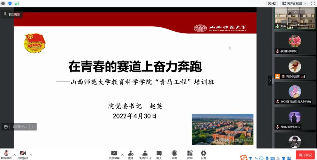 在线上举办了第六期“青马工程”专题讲座,院党委书记赵英作了题为《在青春的赛道上奋力奔跑》的专题报告。全体青马学员聆听了讲座,讲座由院团委副书记高敏君主持。