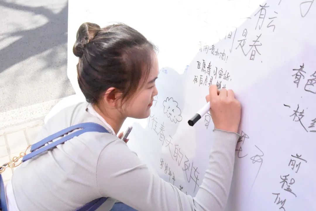 杨柳风柔,玉兰月淡,拂面和风送来点滴美好。本次活动共开设“春日邮局”“齐绘纸鸢”“春日看花”三个环节。同学们在便签上写下美好祝愿,并交换传递;或将画笔蘸足春天的颜色,让原本空白的风筝在奇思妙想下变得浮翠流丹;或在展板上写下春日诗句,将文字之美共享。