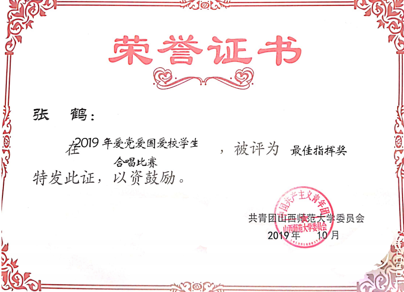 2019年“爱党爱国爱校学生合唱比赛”最佳指挥奖